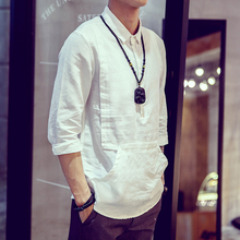 日系夏季七分袖麻料衬衫男衬衣修身型韩版套头棉麻上衣透气青年潮