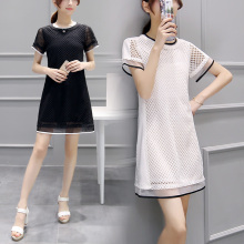 2017夏装新款韩版女装圆领短袖镂空蕾丝连衣裙短裙宽松显瘦直筒裙