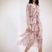 仙气飘飘 2017春夏 真丝唯美印花 飘逸层叠荷叶摆连衣裙【Q1709】