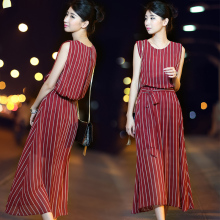 2016夏装新款大码女装显瘦长裙淑女气质长款韩版雪纺条纹连衣裙女