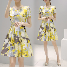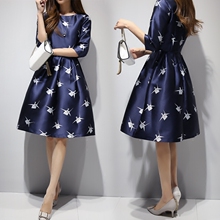 2017春装新款韩版女装中长款圆领修身显瘦a字裙 时尚印花连衣裙女