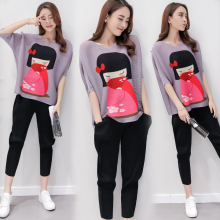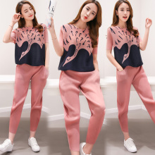 2016夏季新款韩版重工褶皱套装印花短袖上衣九分裤时尚两件套女装