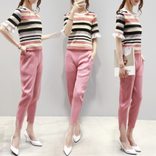 2016夏装新款修身显瘦两件套女条纹雪纺上衣褶皱套装九分裤小脚裤