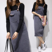 2016秋冬新款长袖针织直筒背带裙两件套时尚套装裙中长款连衣裙女