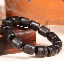 天然开光黑檀木手链佛珠 雕刻六字真言佛珠手链 桶珠手串念珠包邮