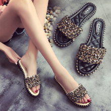 2017夏韩版新款时尚水钻铆钉凉拖鞋百搭露趾室外穿沙滩平底拖鞋女