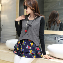 珊雨2017春秋打底小衫女韩版修身假两件套印花拼接针织小衫女潮