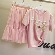 泰国潮牌2017夏装新款女装亮丝粉色T恤上衣纱裙欧洲站洋气套装潮