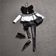 欧洲站2017春装欧货新款女装潮时尚长袖上衣皮裤小脚裤套装两件套