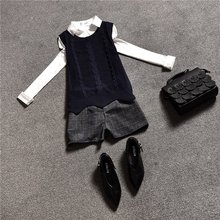 欧洲站2017春装欧货潮新款女装时尚衬衫针织衫马甲短裤三件套套装