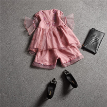 欧洲站2017夏装新款女装欧货潮时尚欧根纱娃娃款上衣短裤洋气套装