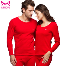 猫人情侣款保暖内衣男士女薄款纯棉本命年大红色圆领秋衣秋裤套装
