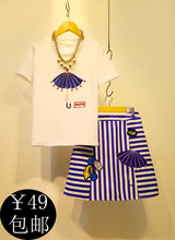 2017夏季新款韩版女装 卡通印花上衣+条纹短裙两件套休闲套装套裙