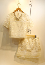 2017春新款韩版时尚圆领半袖钩花镂空蕾丝小衫两件套装连衣裙女潮