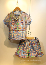 韩国 2017夏新款时尚欧美高端蕾丝印花短袖上衣+短裤两件套装