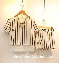 韩国东大门2017夏季短袖竖条纹蕾丝拼接上衣+短裤休闲两件套套装