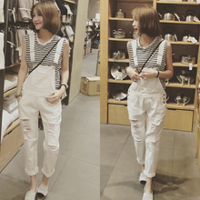 2016夏季新款宽松磨破洞白色牛仔背带裤九分裤女韩版休闲裤子学生