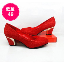 中跟婚鞋红鞋42大码红鞋女鞋厂家新娘结婚敬酒鞋粗跟蕾丝古典孕妇