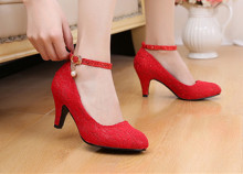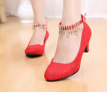 粗跟绑带水钻闪亮婚鞋大红蕾丝亮片高跟小码34新娘鞋婚纱礼服女单