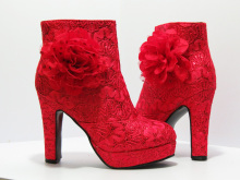 大红色短靴绸缎面厂家新娘结婚敬酒鞋礼服棉靴子中跟婚鞋大码