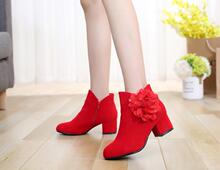 时尚婚鞋大红色绒布净面短靴加厚毛毛新娘结婚敬酒礼服粗高跟拉链