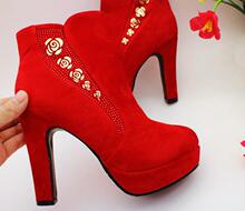 包邮冬季红色婚鞋棉靴子加厚毛毛低跟大码靴子新娘结婚平绒