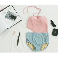 candy-原创bikini撞色三角连体小胸聚拢温泉保守遮肚显瘦游泳衣女