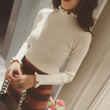 冬韩国2016新款简约纯色甜美木耳边螺纹领口套头针织弹力打底衫女