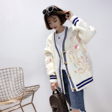 春秋季新款韩版宽松复古花朵刺绣v领外套中长款针织开衫毛衣女潮