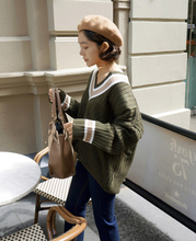2016秋装韩版新款中长款慵懒休闲宽松V领条纹套头毛衣针织衫外套
