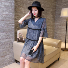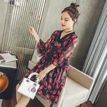 裙子套装夏季2017新款女潮两件套中长款七分袖宽松显瘦雪纺连衣裙