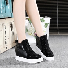 春秋季新款水钻加绒厚底内增高坡跟休闲鞋学生金属拉链高帮女鞋潮