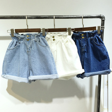 2017夏新款韩国水洗复古松紧带牛仔花苞短裤女卷边高腰阔腿裤热裤