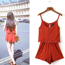 海边沙滩短裤度假修身显瘦复古高腰阔腿裤红色刺绣吊带连体裤女夏
