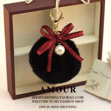 韩国毛绒汽车饰品 珍珠丝带包包挂件 獭兔毛球钥匙扣礼品