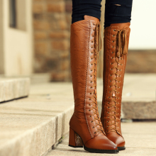 秋冬英伦风尖头高跟过膝长靴真皮绑带粗跟高筒靴复古骑士靴潮