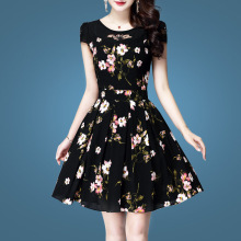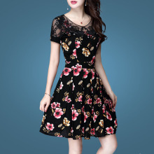 短袖蕾丝雪纺连衣裙夏季2017新款韩版修身显瘦印花女装裙子夏女裙