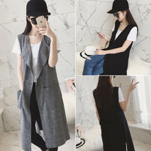 春夏新款时尚气质中长款后背开叉休闲棉麻口袋马甲马夹外套女学生