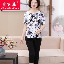 苏丽美中老年女装时尚印花雪纺衫大码妈妈装短袖T恤衫夏装新上衣