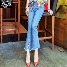 高腰微喇牛仔裤女裤夏季韩版九分裤毛边鱼尾八分裤开叉喇叭裤女潮
