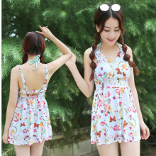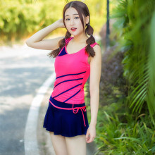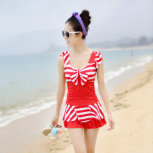 包邮韩国温泉泳装学生少女海军风条纹连体裙式显瘦聚拢女士游泳衣