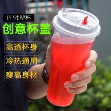 90口径一次性塑料奶茶杯子高透瘦高饮料果汁杯加厚卡通杯带盖包邮