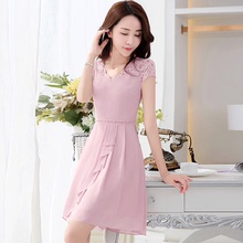 2017夏季新款韩版气质修身显瘦蕾丝拼接雪纺连衣裙中长款裙子女夏