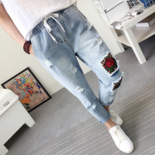 破洞牛仔裤女2017春夏季新款松紧腰宽松牛仔哈伦裤高腰显瘦九分裤