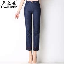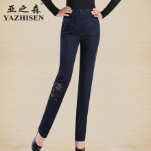 新款高腰弹力牛仔裤中年女士修身显瘦直筒女长裤大码刺绣妈妈裤子