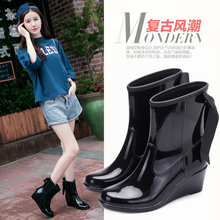 春夏中筒雨靴女成人水鞋时尚防水鞋坡跟飘带胶鞋套鞋防滑下雨鞋女