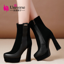 冬季圆头粗跟磨砂皮女鞋加绒大码女靴防水台高跟鞋真皮靴子中筒靴
