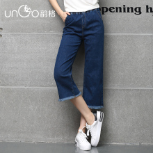 韵格2017春夏款宽松八9分微喇叭牛仔裤女毛边裤脚流苏阔腿裤s0656