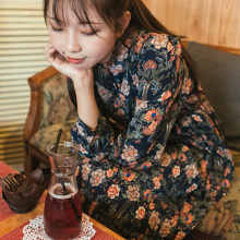 2016秋冬新款宽松立领加绒加厚雪纺碎花连衣裙高腰打底百褶长裙潮