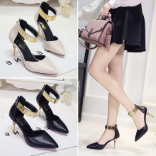 春季新款女鞋尖头高跟鞋细跟单鞋金属一字带性感中空包头凉鞋女夏